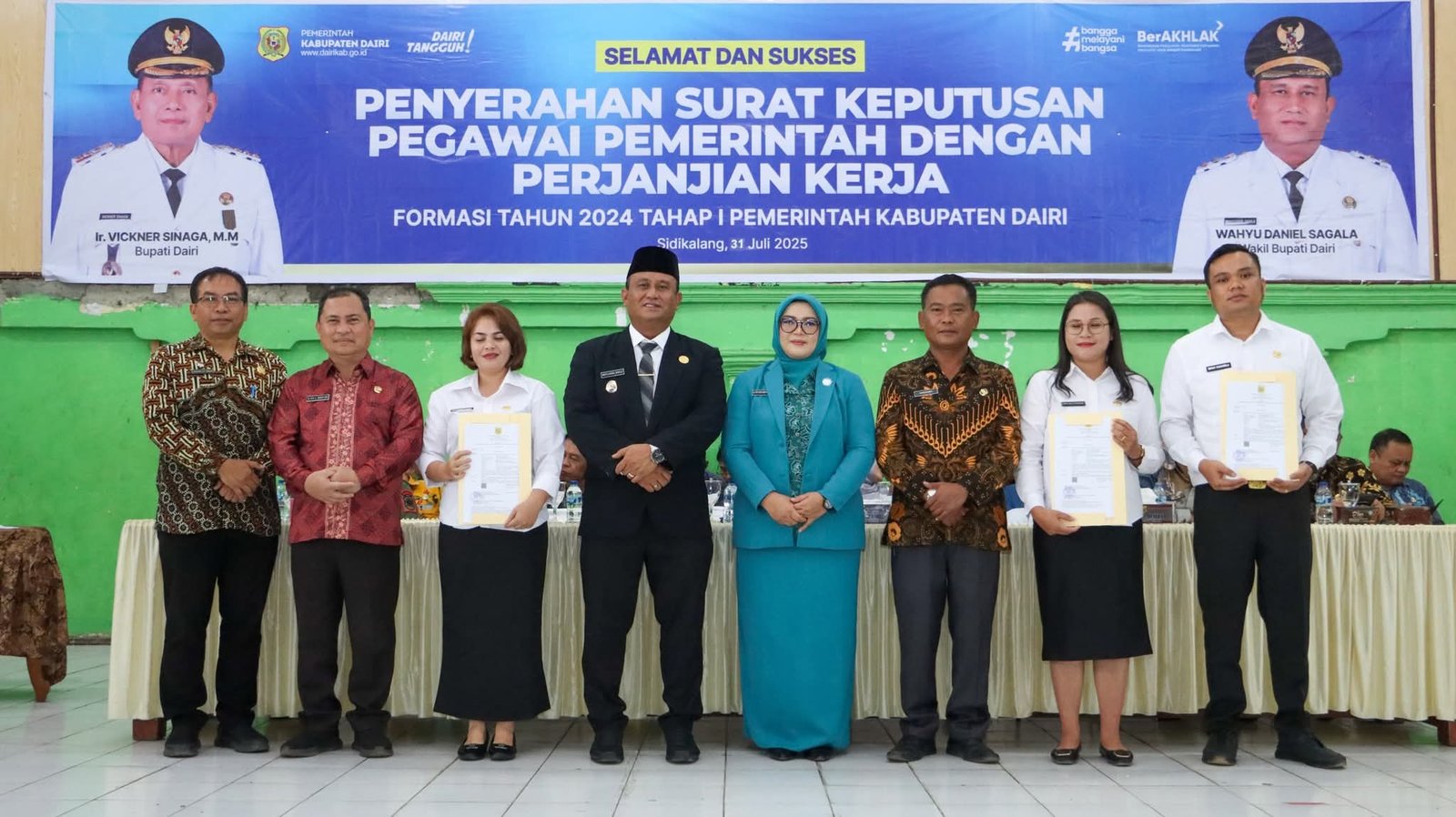 Dairi, Kabar24jam – Bupati Dairi, Ir. Vickner Sinaga diwakili Wakil Bupati Dairi, Wahyu Daniel Sagala menyerahkan 644 Surat Keputusan (SK) Pegawai Pemerintah Dengan Perjanjian Kerja (PPPK) formasi Tahun 2024 tahap I Pemerintah Kabupaten Dairi. Kamis (31/7/2025) di GOR Sidikalang